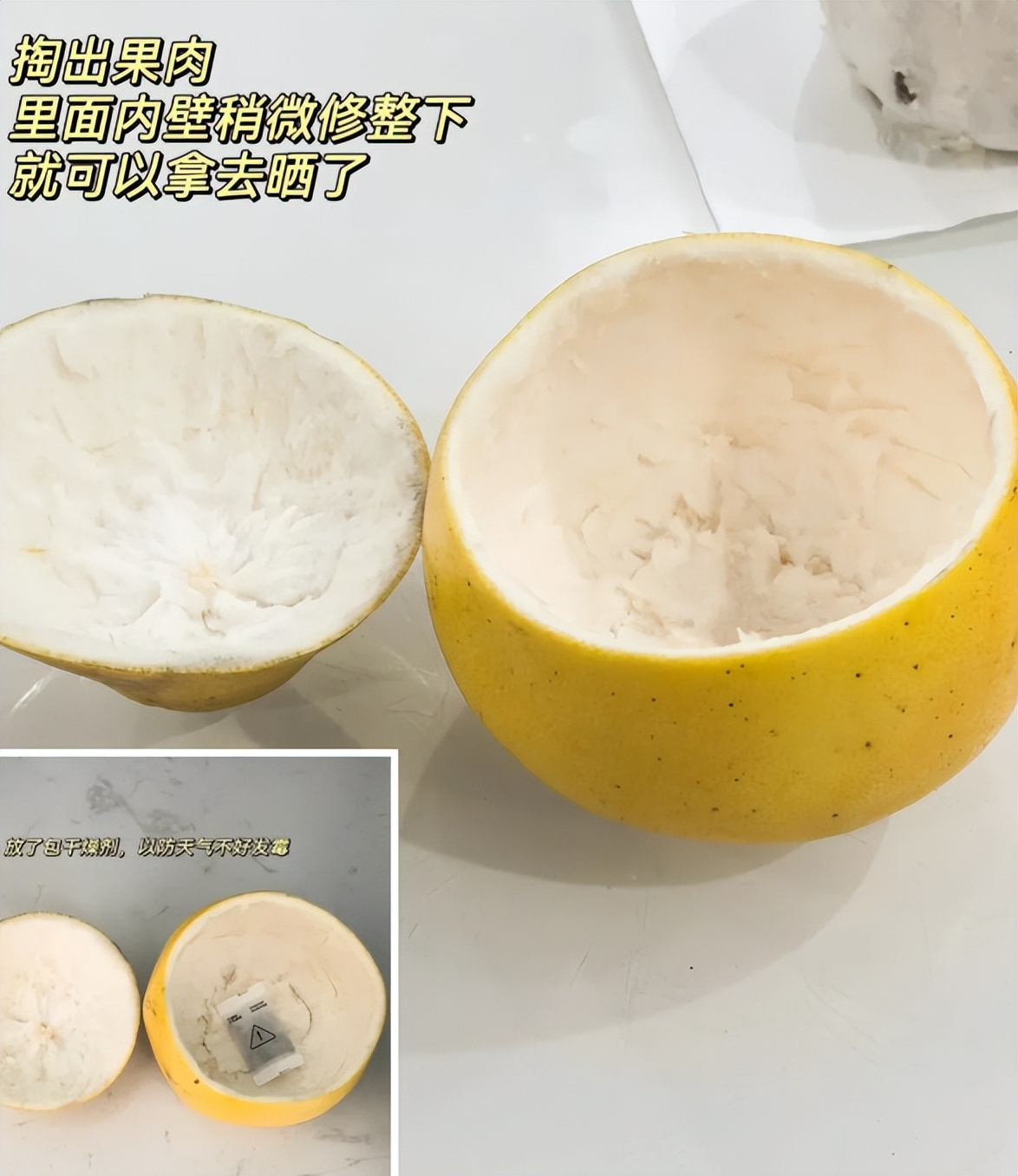 把柚子里面的果肉掏出来,内壁稍微修整一下就可以晾晒了。