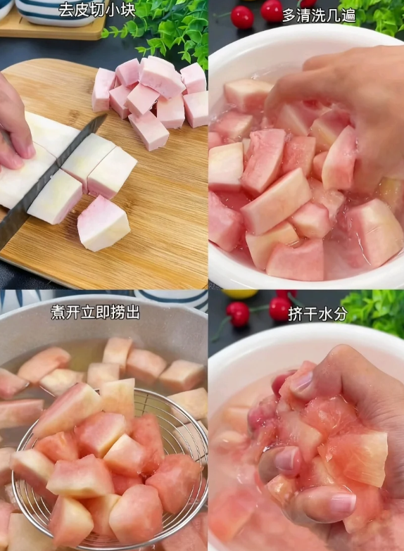 先把柚子皮切成小块,放在清水里清洗一下。再煮一煮,煮开后立马捞出来挤干水分备用。