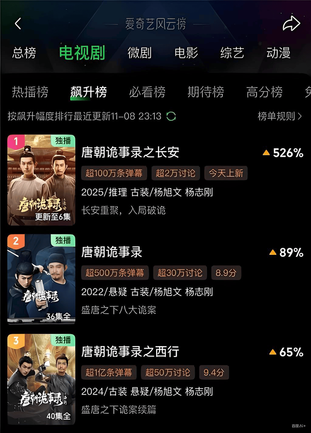 《唐诡3》开播前就有超300万"诡友"预约,开播即爆,更带动前作热度回升,三部曲包揽爱奇艺飙升榜前三。这种跨季延续的IP热度,让品牌投放不局限于单季剧集周期,而是可借助IP长尾效应实现持续曝光。