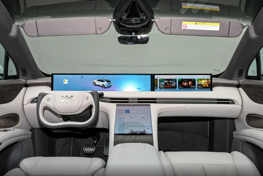 新款智己LS7全车四个车门都是电吸门,手只要放在门把手处车门就会自动弹开,实现优雅从容的打开车门。踩下刹车踏板之后,主驾驶门就会自动关闭,坐进前排之后感觉整个乘车视野很开阔,那是因为该车采用超广角穹顶玻璃,能够提供106度的纵向视觉宽度。26.3英寸中控屏和15.5英寸副驾娱乐屏依旧显眼,这两块屏幕看似没变化,实则取消了上下升降功能,内置丰富科技配置,搭载8295车机芯片,在系统响应灵敏度方面完全不需要担心。
