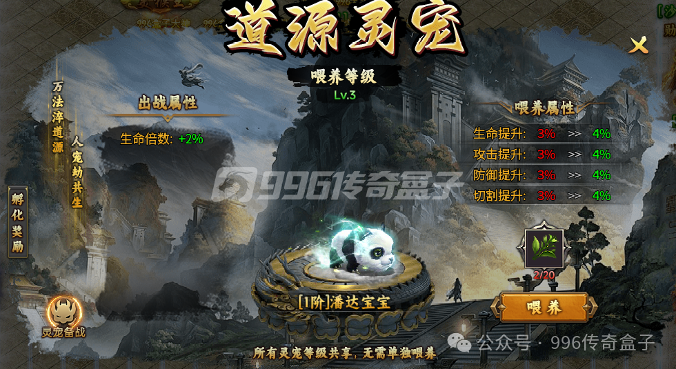 灵宠应该是这个服的重要玩法,一大陆做任务的时候会给一个小熊猫。可以跟随出战,有专属绝招,不过目前没看出它什么时候使这个绝招,只看见卖萌了!灵宠隔一段时间可以免费孵化,也可以花费灵符孵化,相同的等阶的灵宠可以拖拽合成更高阶的灵宠,但是有成功率,成功了会合成更高阶的,失败了灵宠会消失,返还蕴灵草。三阶以上的灵宠合成是百分百成功的。蕴灵草可以喂养灵宠,所有灵宠都是等级共享的,无需单独喂养,所以只需要看哪个灵宠等阶更高,属性更强,直接替换出战就可以。