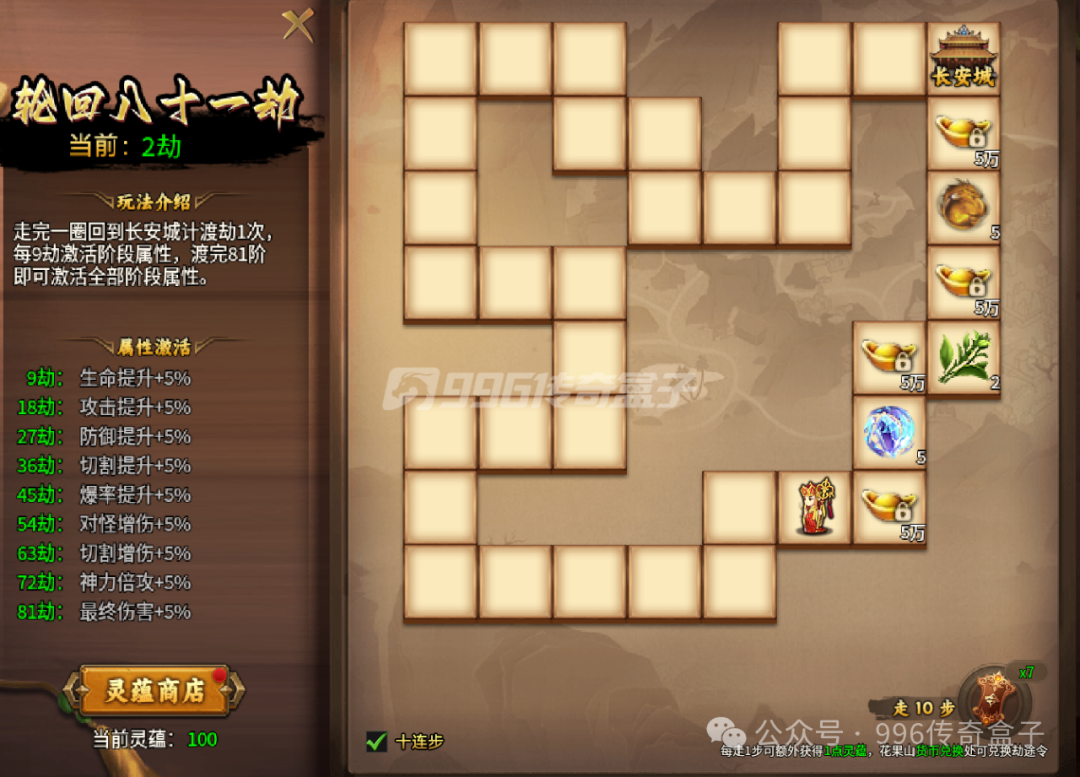 玩法挺多的,首先是轮回劫,劫途令刷怪掉,也可以在货币兑换处兑换,来源挺多,来的也快。这个轮回劫通俗一点来说,就是飞行棋,一个劫途令走一步,从长安城出发,回到长安城算一劫。每九劫激活阶段属性,除此之外,每走一步,会有一点灵韵,可以在灵韵商店兑换货币、神器和时装。