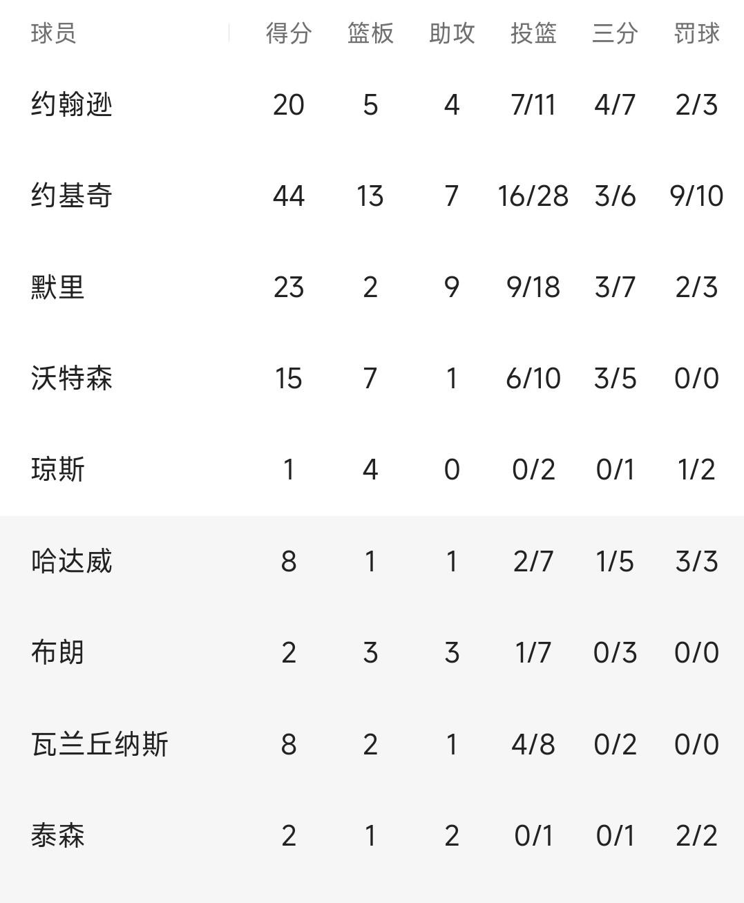 掘金的戈登,上场比赛受伤,他的缺阵给掘金带来不小的麻烦。约老师累的够呛,拿了44分13篮板7助攻,默里23分9助攻,约翰逊20分。