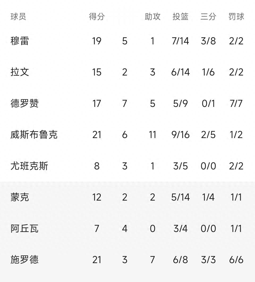 拉文今天表现不佳,全场14投6中,拿到15分。德罗赞贡献17分7篮板5助攻,其中在末节决胜时刻,连拿7分稳定军心。替补出战的施罗德,效率非常高,全场8投6中,三分球3中3,罚球6中6,拿到21分7篮板7助攻,可谓是球队取胜的关键。
