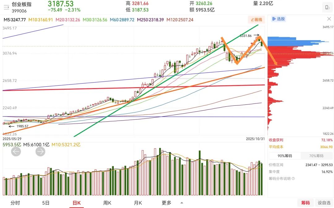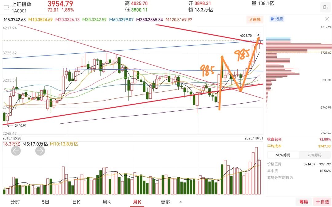 月线视角:此前沪指突破4000点时已提示需观察月底收盘确认真假突破,10月收盘ZUI终回落至压力位。且高点4025点通过技术测算得出(3674-2689=985,985+3040=4025),精准对应显示该点位具备较强阻力,短期(三五天)重新突破概率极低。