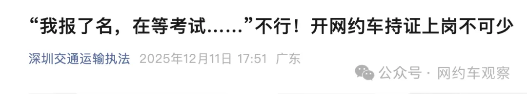 据悉,12月3日执法人员在深圳宝安西乡重点区域进行执法时,依法对一辆网约车进行检查。执法人员发现驾驶员并未取得网约车驾驶员证,仅驾驶的车辆具备网约车车辆运输证,属于单证司机。