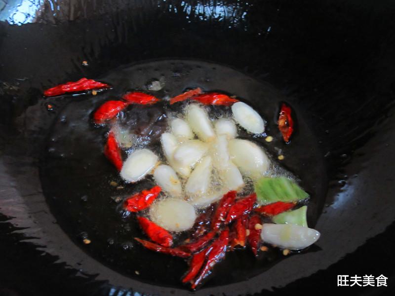 热锅注入适量的食用油,烧至六分热,然后放入蒜瓣、红干椒和生姜,炸出香味。