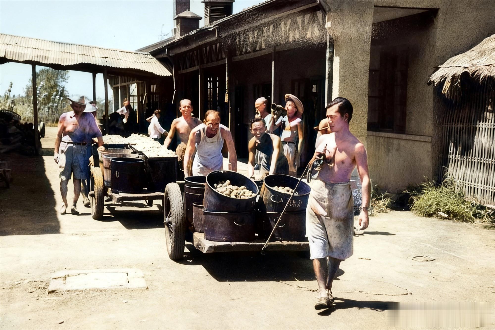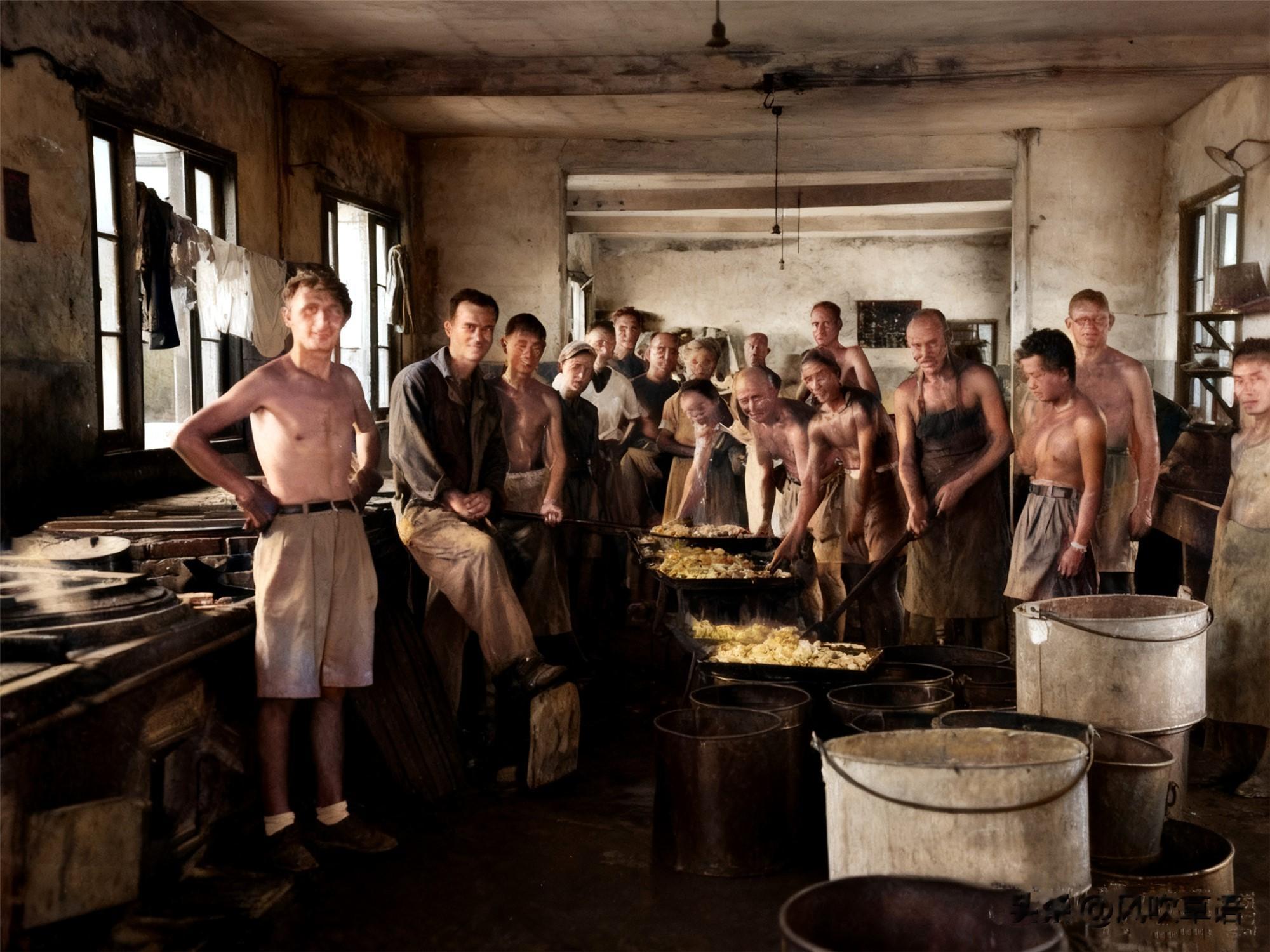 正在厨房内加工食物的厨师们,因为此时已经被“解放”,所有此时食物的花样很多,分量也很足。厨师们为了干活方便,差不多都光着膀子,从身健硕的肌肉看,说明他们在吃食方面并没有受太多苦。