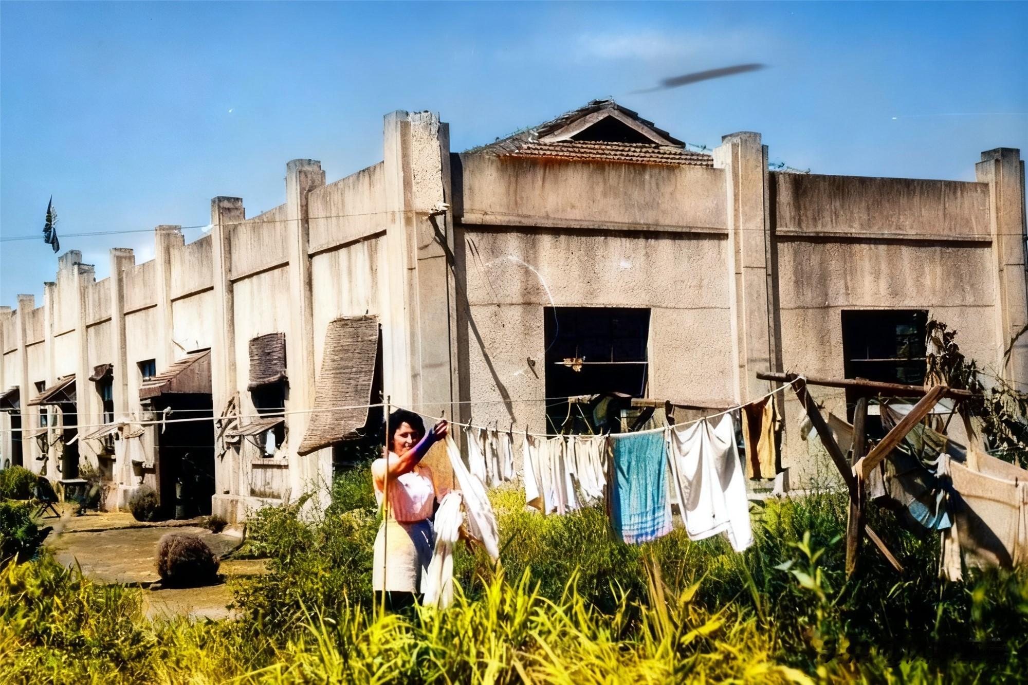 龙华集中营内的女子宿舍,从其规模可以看出,当时关押在这里的女子人数相对较少,一名年轻的女子正在宿舍旁边晾晒衣物。