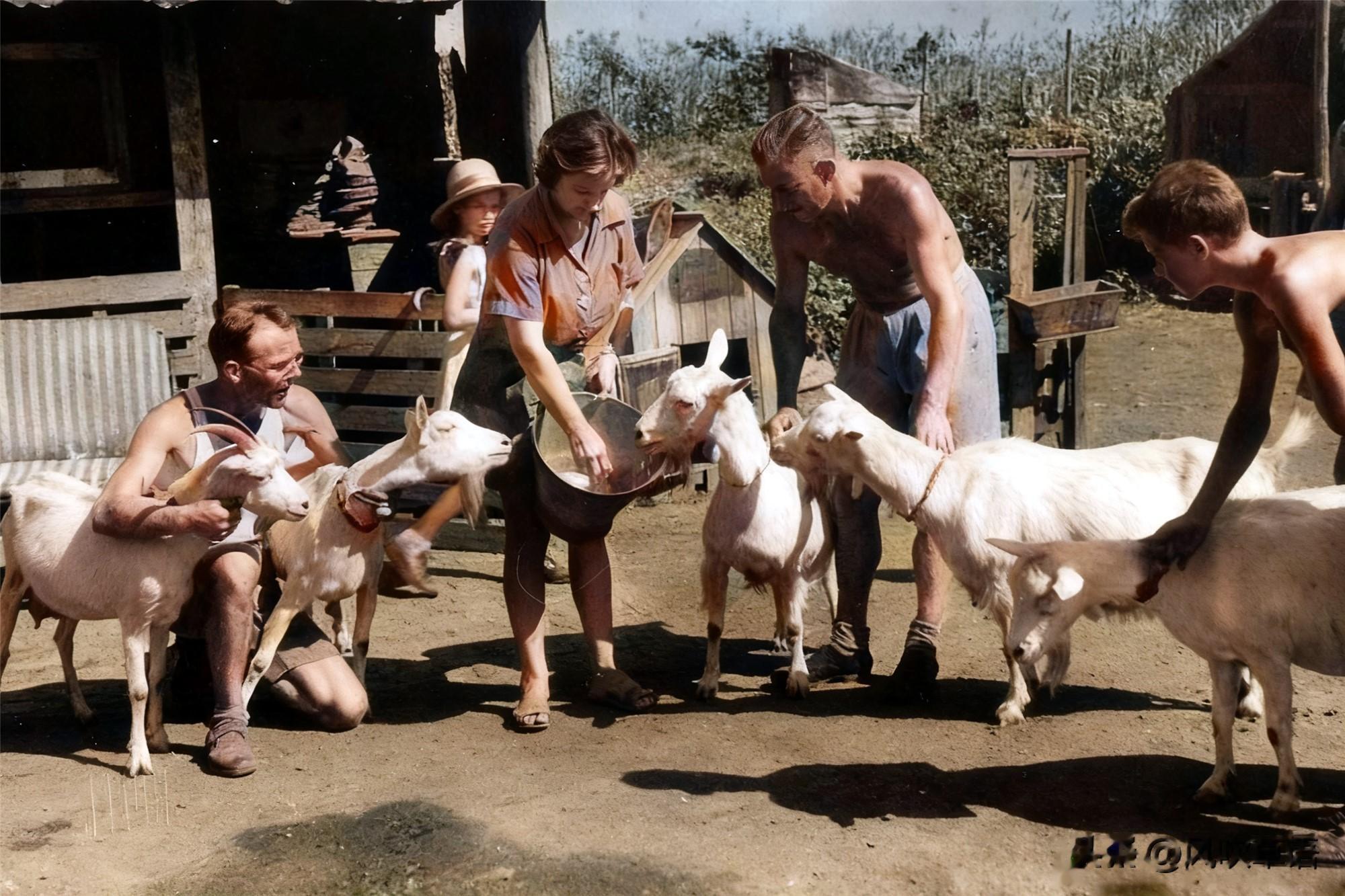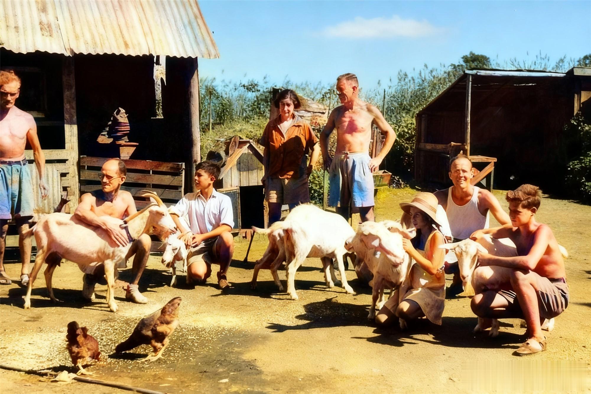 这是集中营内的所谓“农场”,几名男子和几头山羊在一起。这些山羊是他们从小羊羔当做宠物喂起来的,甚至给这些山羊都取了名字。