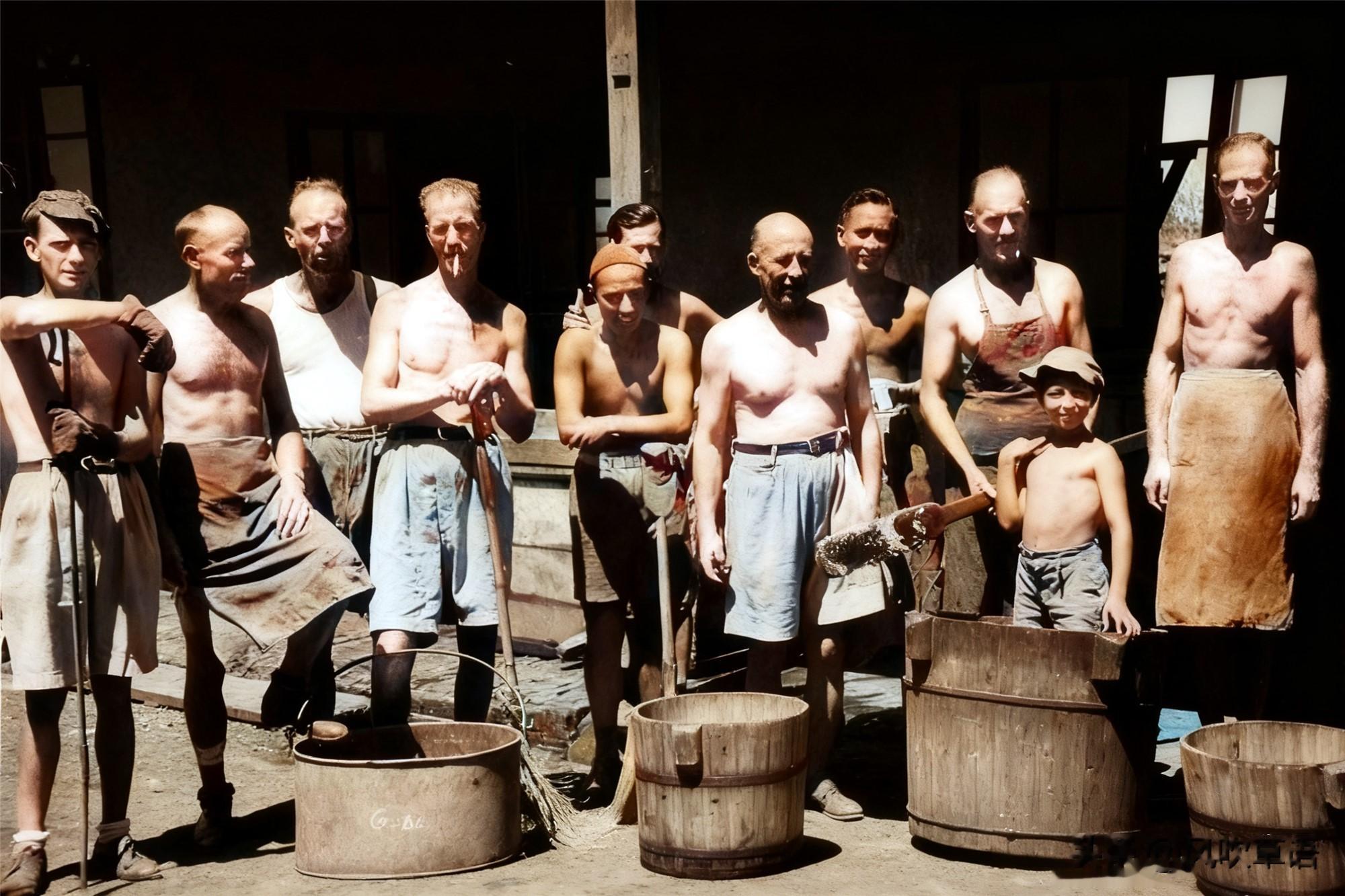 这是集中营的厨师团队,面前摆放着盛放食材的木桶或铁桶。在成人中间还站着一个小孩子,他是一名号手,也是厨房团队的一员。