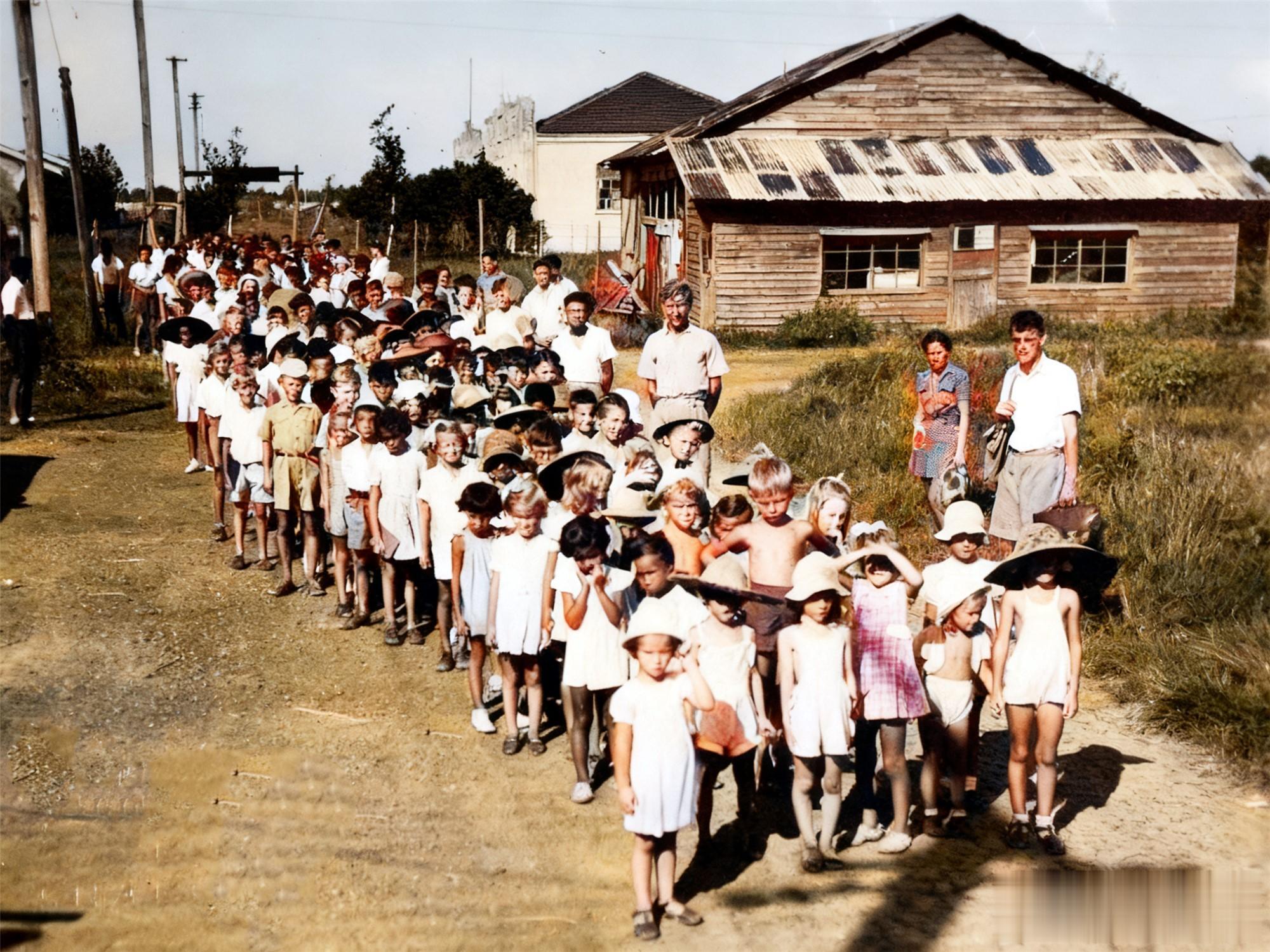 集中营学校的学生们。当时龙华集中营内关押着三百多名儿童,在被囚禁期间,众多在上海各教会名校任教的外籍教师共同组成龙华公学,为这些儿童提供受教育的机会。