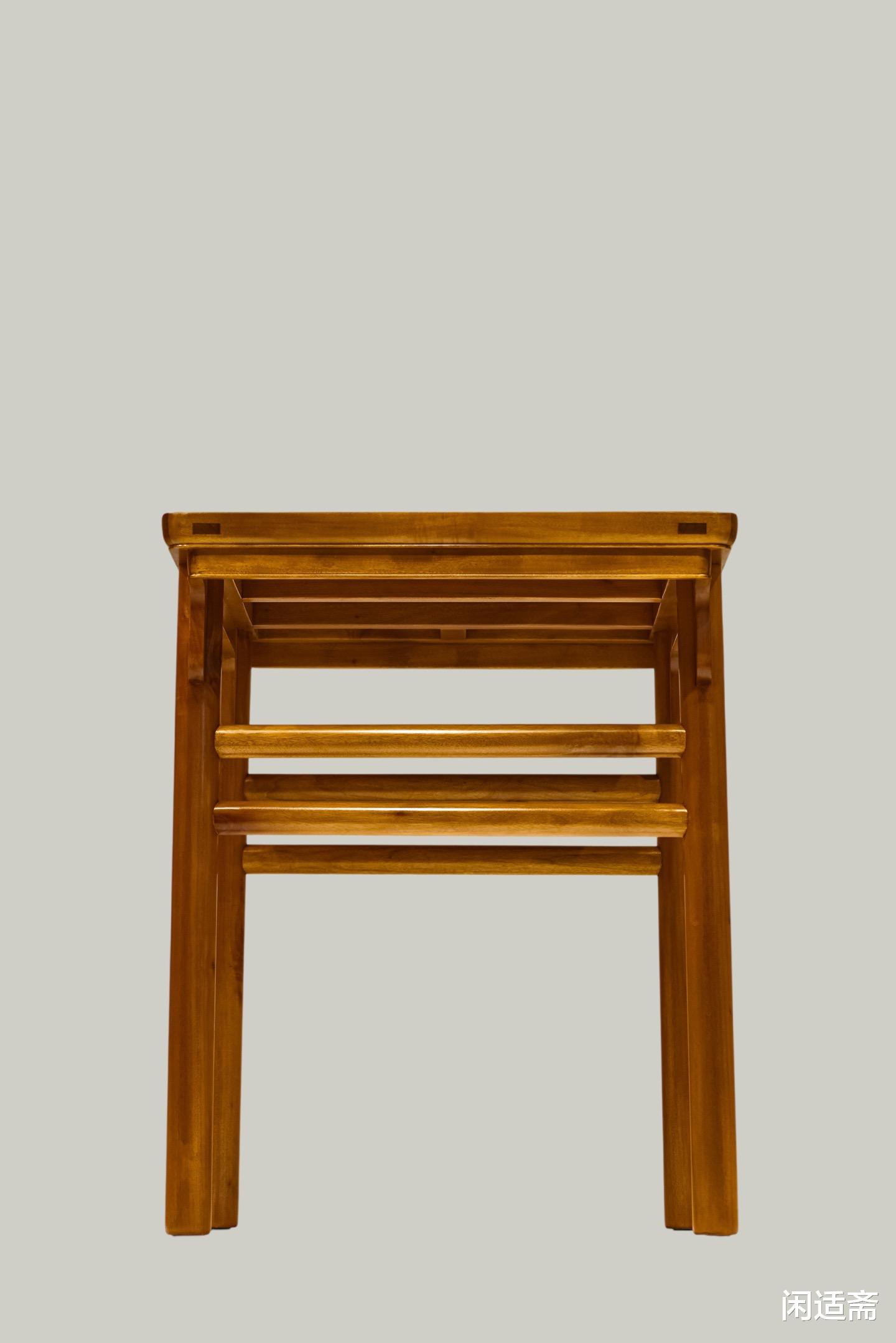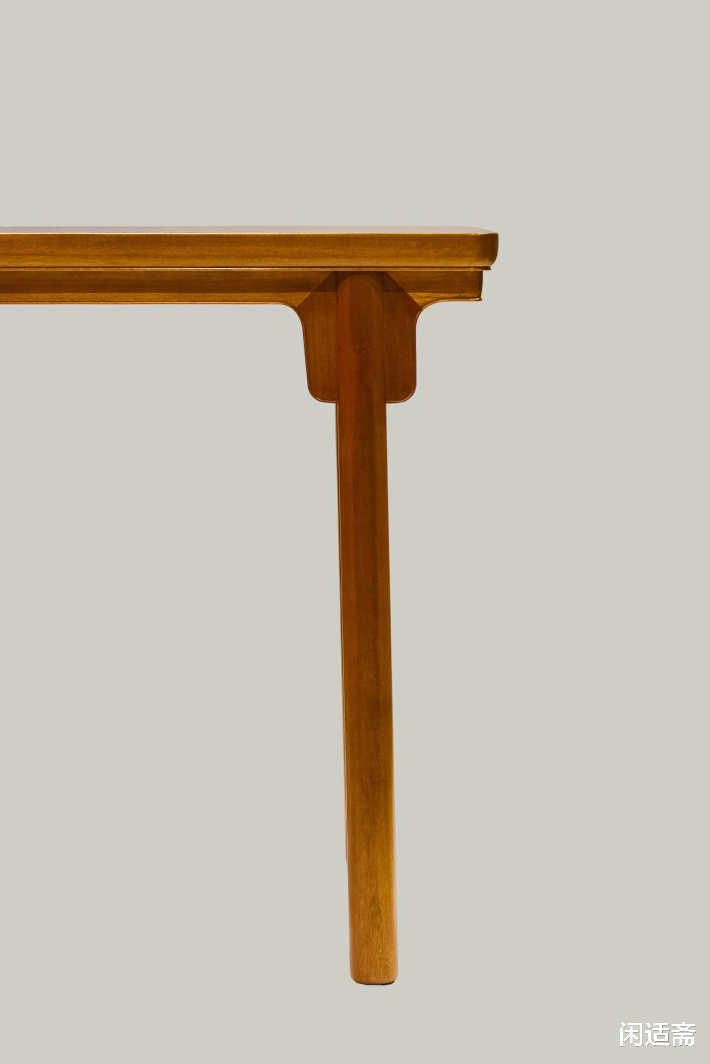 下方采用夹头榫结构,牙板与腿足衔接紧密、稳固耐用;“一腿两牙”设计,牙板导圆处理,内外双圆角打磨,线条流畅柔和,既强化结构稳定性,又增添雅致质感。侧面横撑打破传统圆形、方形做法,采用椭圆形制,线条圆润流畅,与桌面碗口线、牙板导圆细节上下呼应,整体造型和谐统一,既保留古法韵味,又增添一丝灵动,优雅中不失大气,尽显设计巧思。