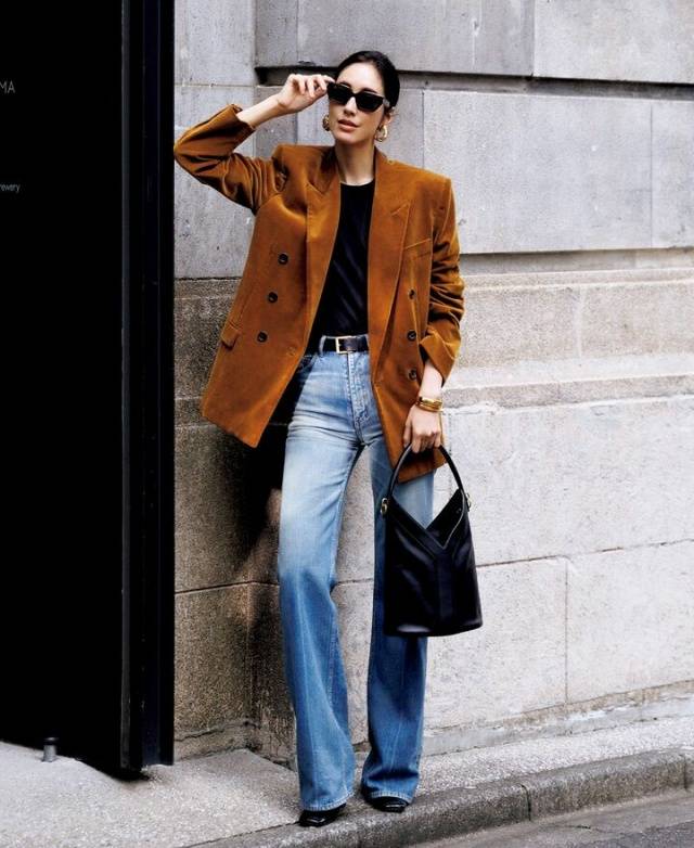 今秋,棕色灯芯绒定制夹克因其款式丰富、工作休闲两宜而备受瞩目,关键在于其松弛而高雅的廓形。即使内搭黑色针织衫与喇叭牛仔裤,也能轻松展现时尚感。搭配黑金配饰,更添利落奢华气质。