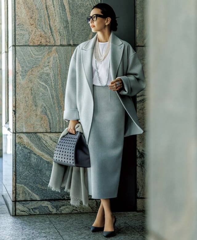 以透明感粉灰色夹克与裙子为主,搭配白色与灰色叠穿。白色衬衫和珍珠项链提升上半身清爽感,深一度的灰色包袋和鞋履打造城市优雅造型。精心计算的配色尽显知性,适合商务场合。