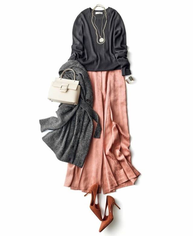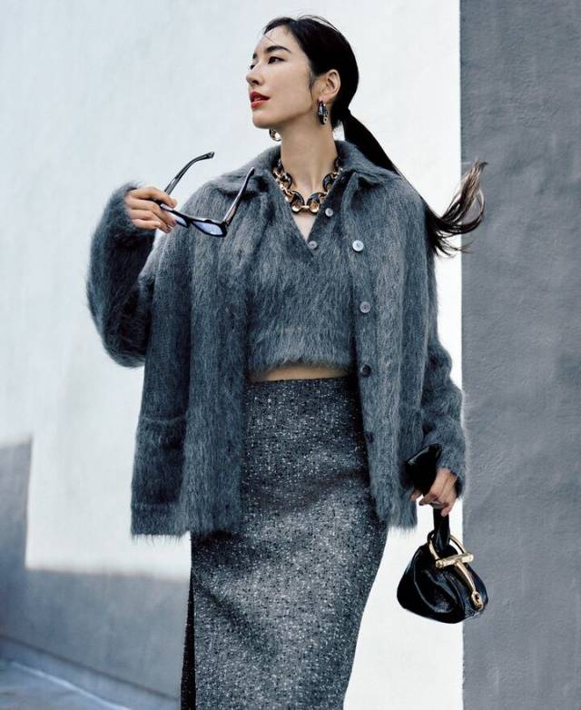柔软蓬松的羊毛马海毛开衫与针织衫,搭配帅气细羊毛铅笔裙,材质对比鲜明,打造今年特色灰色穿搭。立体黑色与金色耳环、项链、包包点缀,增添利落感,展现时髦气场。