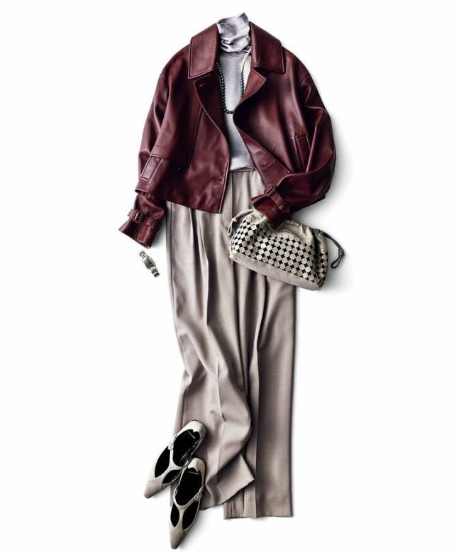 成熟酒红色皮革夹克,搭配浅灰色高领针织衫与长裤,营造出疏朗的致层次感。灰色魅力的巧妙点缀在于光泽小物:包袋与鞋履选用反光金属色调,增加轻盈感。珍珠母贝与黑珍珠渐变项链、深灰表盘腕表等细节,完善无懈可击的色彩搭配。
