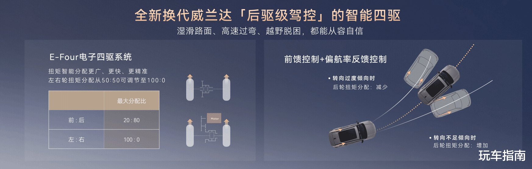 当所有油车发布都在大肆说智能化的当下,换代威兰达重新把少数人提及的机械素质摆上桌面。全新威兰达E-FOUR电子四驱可以罕见实现前后轴驱动力100:0-20:80的智能调节,动力系统通过对四驱系统和悬挂的智能调控,让这台城市SUV在保持舒适的同时,具备了超越同级的操控稳定性和通过性,过弯更灵活、脱困更迅速。应用全新ECB电子控制制动系统,轮上扭矩分配更快更精准,大幅优化侧倾控制,实现了更线性跟脚的制动脚感,显著缩短制动距离,过弯更稳。