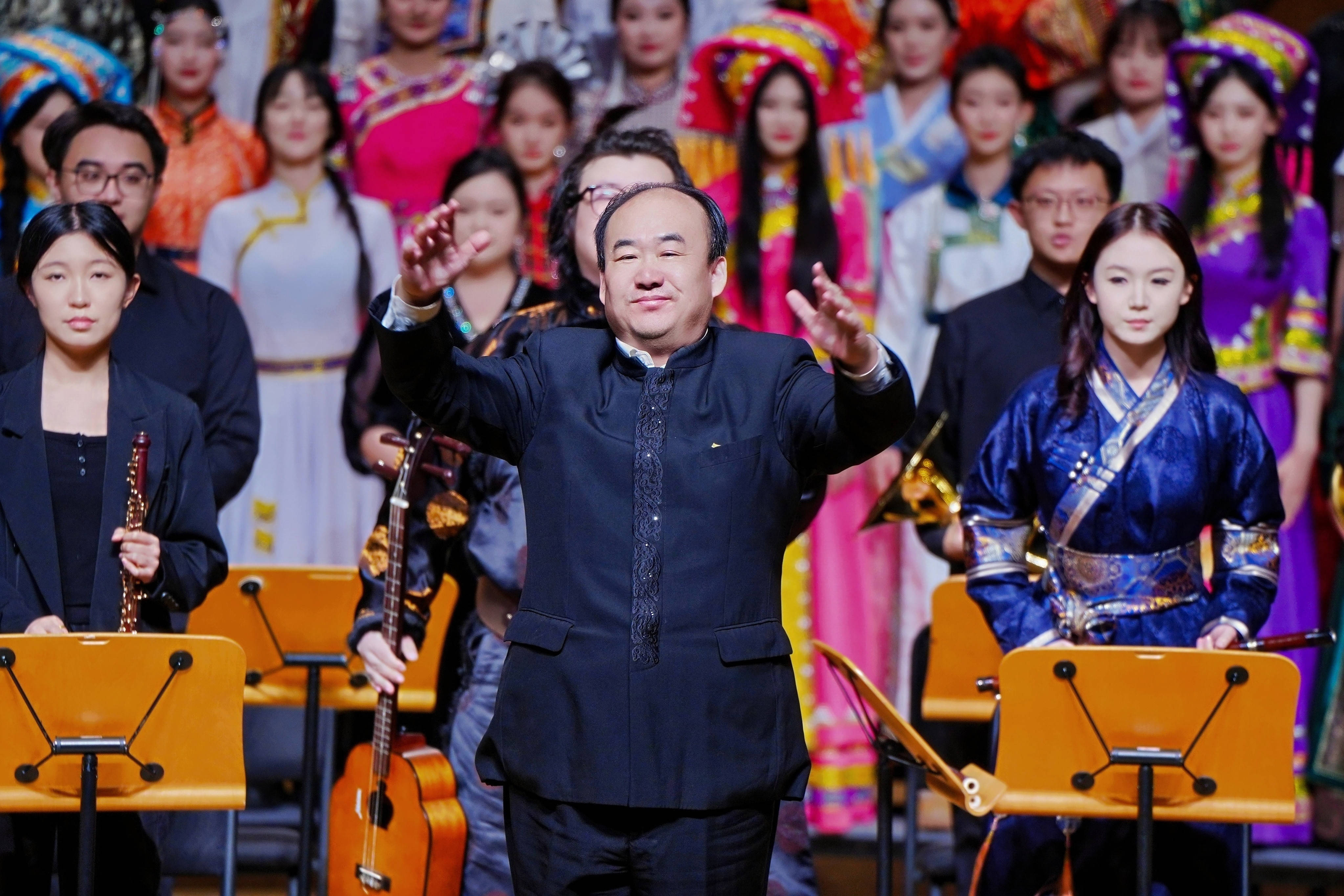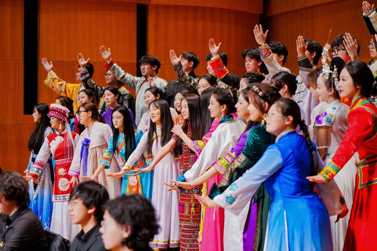当晚,国图艺术中心音乐厅氛围热烈。随着开场钟声奏响,中央少数民族青年合唱团率先登台,开场《国漫传奇》组曲的热血旋律、配合中央少数民族青年合唱团阿卡贝拉之声带来的侗族大歌《大山真美好》、《筑塘歌》的千年韵律结合现代编曲,瞬间点燃现场气氛。随后,醒耳人声乐团带来《好想爱这个世界啊》《蜃楼》《回到拉萨》三首作品,细腻演绎赢得台下阵阵掌声。