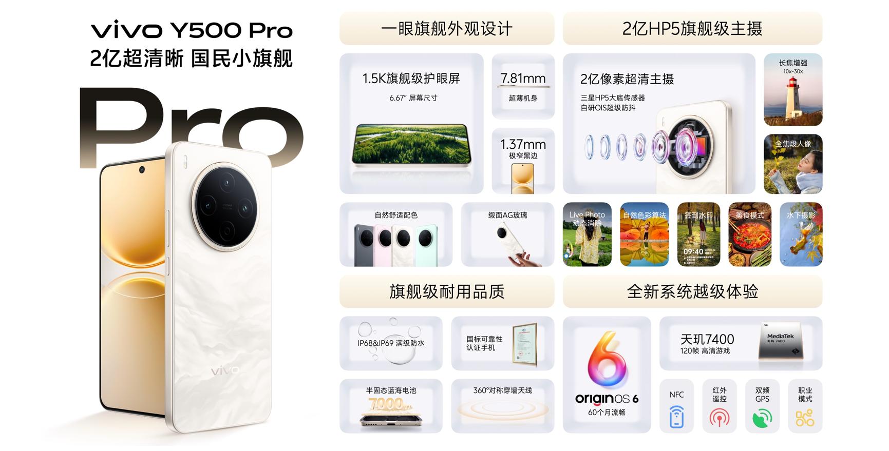 智东西11月10日报道,刚刚,vivo正式发布了中端手机新品vivo Y500 Pro系列,其重点在影像、设计、系统、耐用、续航等方面进行了升级,配备了2亿HP5旗舰级主摄、7000mAh半固态蓝海电池、6.67英寸1.5K旗舰级护眼屏,vivo对其定位是“国民小旗舰”。
