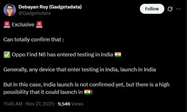 日前,海外爆料达人Debayan Roy在X平台透露OPPO新一代大折叠手机Find N6正在印度进行测试。他表示,设备测试通常意味着发布临近,但在本案中,印度发布计划仍未最终确认。他还表示,Find N6不太可能以一加的品牌名在印度推出。由此来看,距离该机的亮相应该不远了。