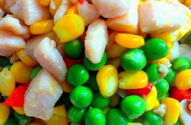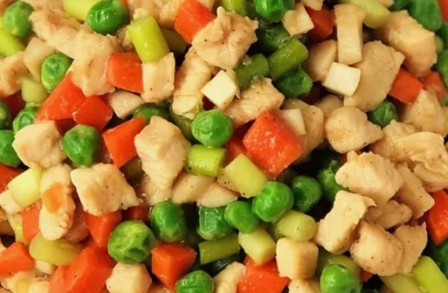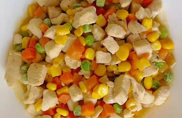 将炒好的蔬菜丁和鸡丁混合,加入适量的盐调味,快速翻炒均匀,使鸡丁和蔬菜丁充分融合。炒至鸡丁完全熟透,蔬菜丁软熟,即可出锅装盘。最后撒上葱花增香,一道色香味俱全的五彩鸡丁就完成了。