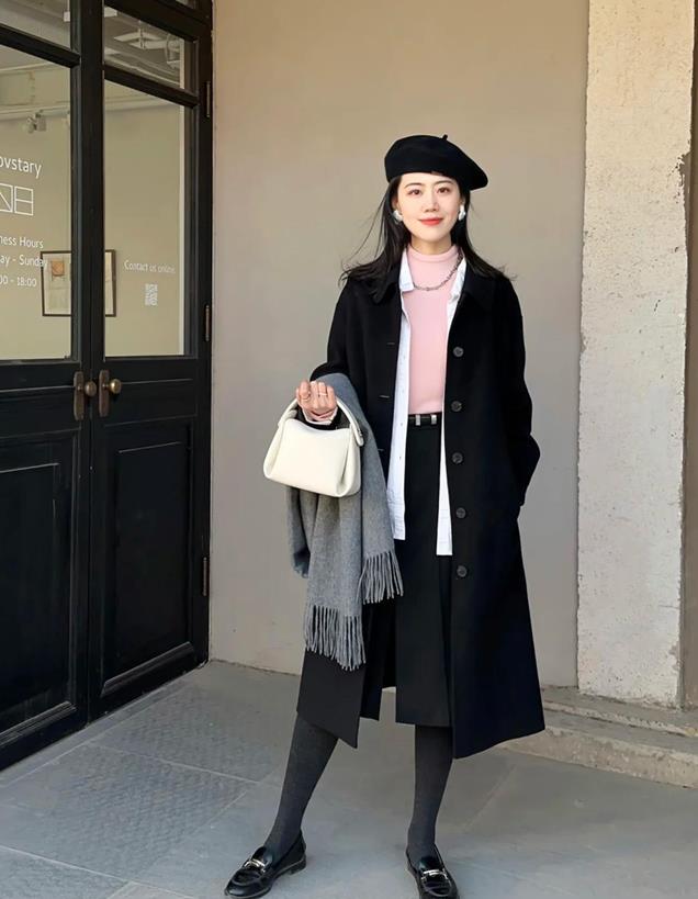 如此搭配无疑是一举两得,不仅将黑色长款大衣的拉长身形效果发挥到极致,更将针织裙柔和温暖的一面展露无疑。