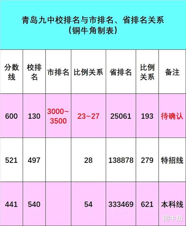 青岛市2025年600分以上人数,暂以3000~3500人计,青岛九中校排名与市排名的比例大约为23~27。