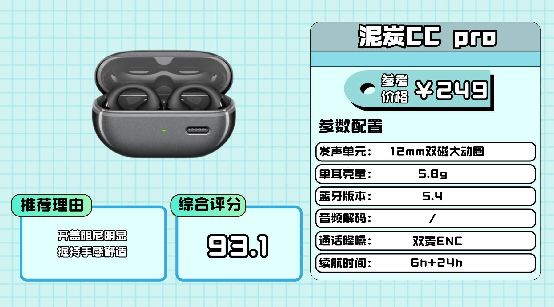 泥 炭 C C P ro 使用液态硅胶与人体工学结构,佩戴轻松不夹耳,在学习或久戴场景下表现舒适,但剧烈运动时偶尔会出现轻微松动。采用 12mm 大动圈与 360° 空间音效,声场开阔,中低频饱满,人声与乐器分离度清晰,高频延展则略显保守,适合听流行和人声类歌曲。蓝牙 5.4 连接稳定,双麦 ENC 能减少环境噪声,提升通话质量。支持 IPX5 防水,日常防汗无压力。单次续航约 6 小时,总续航约 24 小时。整体功能齐全,但缺少更低延迟的游戏模式,对娱乐党来说吸引力稍弱。