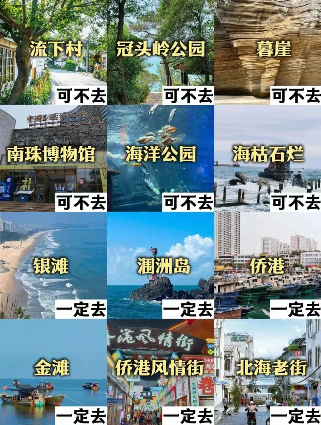 海滨风光优美:银滩沙质细腻洁白,是中国南方理想的滨海浴场之一。涠洲岛更是以其原始的海岛风光吸引着众多游客,你可以在岛上观日出日落,欣赏独特的海蚀地貌.