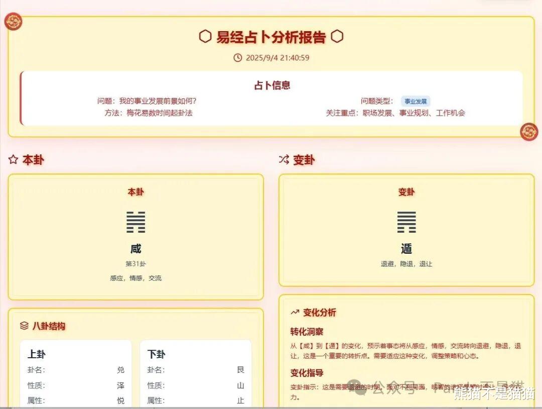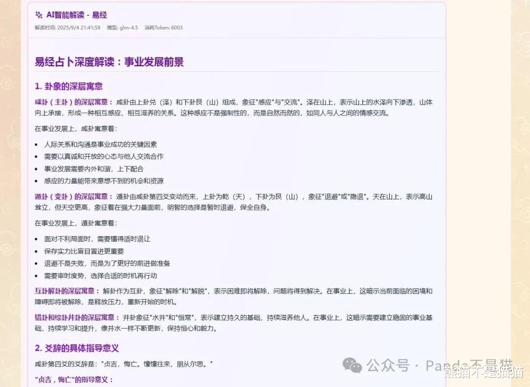 这里熊猫算了一下我的事业,很快啊!就给到了各种信息,但我是一个都看不懂,什么乾坤八卦,完全看不懂,但是可以看到整个内容非常非常的多啊,个人感觉比天桥的老头要靠谱很多,也可以点击右上角下载下来,支持Markdown、pdf以及png长图这几种格式。