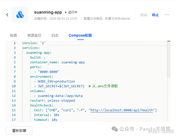 打开绿联的SSH端口,随后我这里通过命令cd /volume1/docker来到熊猫NAS中的Docker存放目录,再通过git clone https://github.com/patdelphi/suanming.git,将其项目下载到本地,如果你的NAS没有安装git,也可以直接到项目页下载项目。