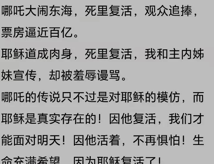 孙海英的原文摘录如下:哪吒大闹东海,死里复活,观众追捧,票房逼近百亿。耶稣道成肉身,死里复活,我和主内姊妹宣传,却被羞辱谩骂。哪吒的传说只不过是对耶稣的模仿,而耶稣是真实存在的!因他复活,我们才能面对明天!因他活着,不再惧怕!生命充满希望,因为耶稣复活了!