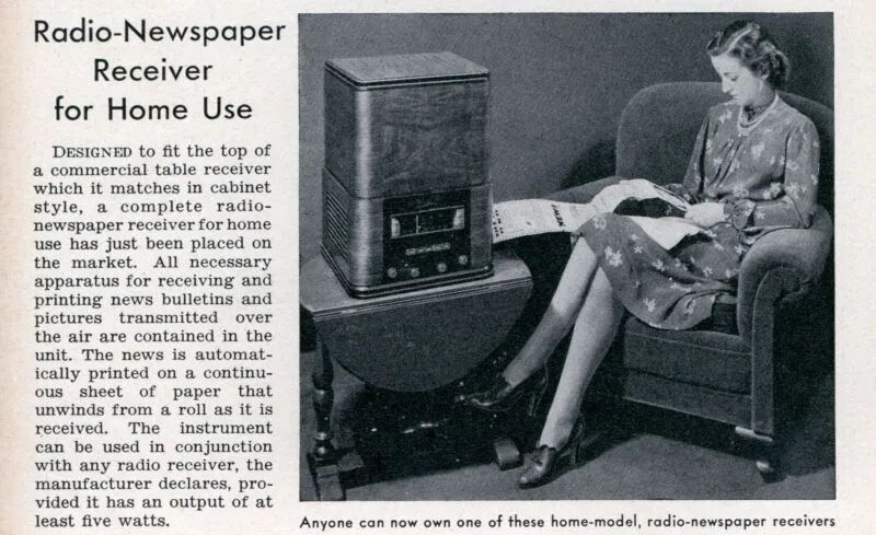 在现代传真机和您最喜欢的博客之间,曾出现过1938年最先进的广播报纸。在20世纪30年代初期,广播是报纸最大的敌人。广播与报纸争夺广告收入,并在经济大萧条时期为精打细算的公众提供免费的新闻选择。它还能提供报纸无法提供的即时更新。20世纪30年代,报纸与广播行业展开斗争,试图封锁电台,阻止它们播出新闻。
