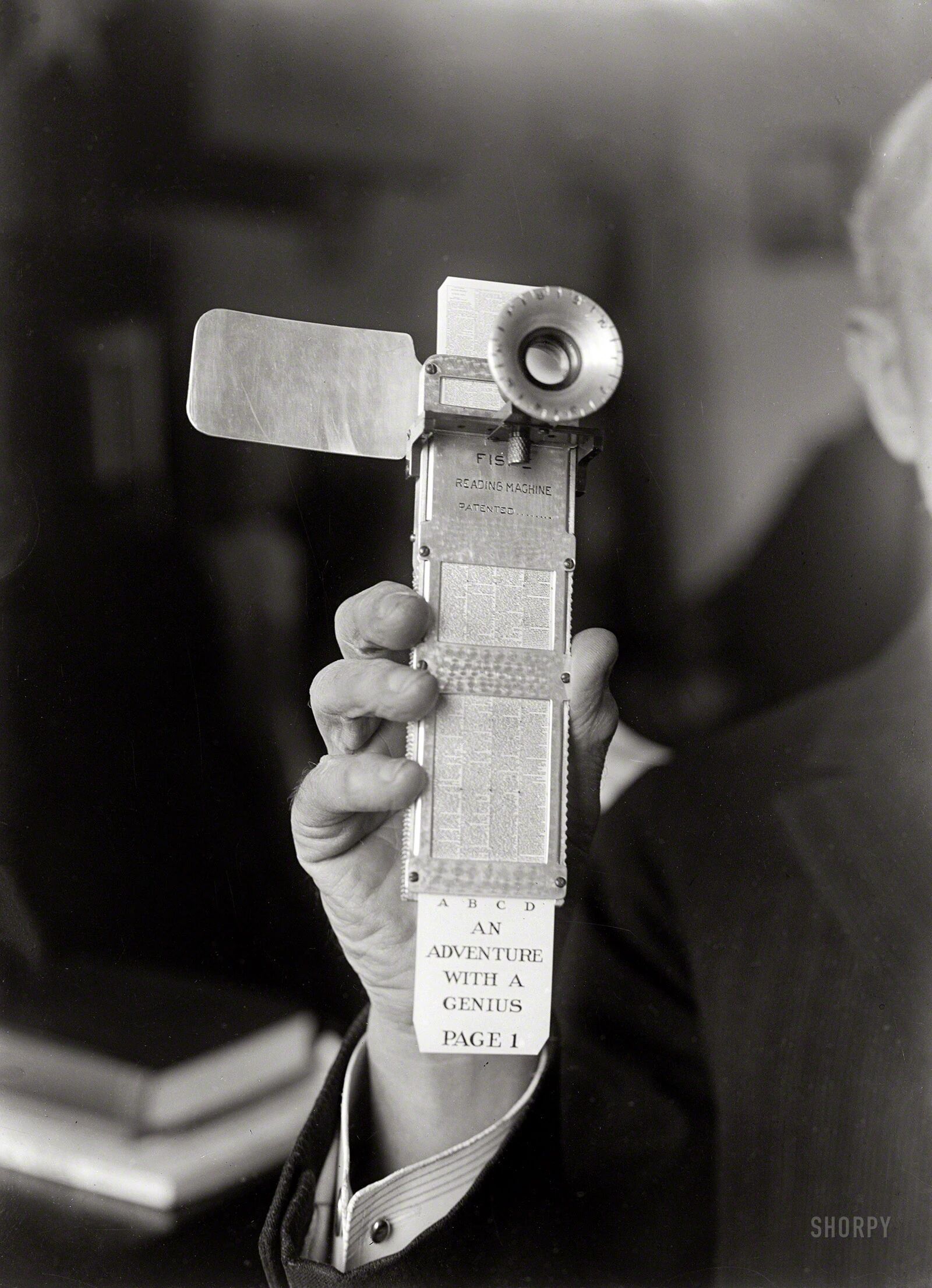“菲斯克阅读机将使书籍过时!”这张照片拍摄于 1922 年左右,照片中是菲斯克阅读机的发明者布拉德利·菲斯克海军少将手中拿着这台机器。