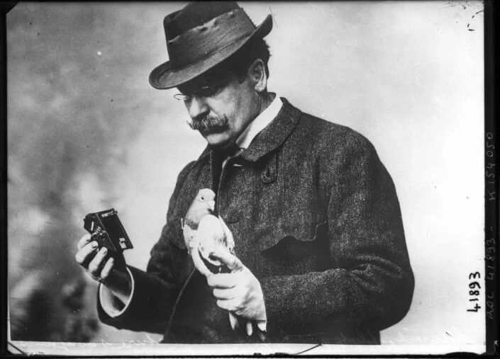 1908年,尤利乌斯·诺伊布隆纳博士获得了一项专利,发明了一种由定时装置驱动的微型信鸽相机。1909年至1911年间,他在德累斯顿、法兰克福和巴黎的国际博览会上展示了这项发明,使他名扬国际。在德累斯顿,观众可以观看携带相机的信鸽抵达,照片随即被冲洗出来,制成明信片出售。