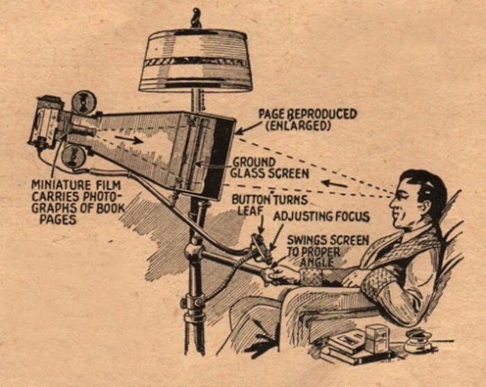 1935年这是一幅出自1935年4月《日常科学与机械》杂志的插图 ,它预言书籍将会以缩微胶片的形式存储。因此,该支架被设计用来放置一个屏幕,屏幕上会显示书页的照片。