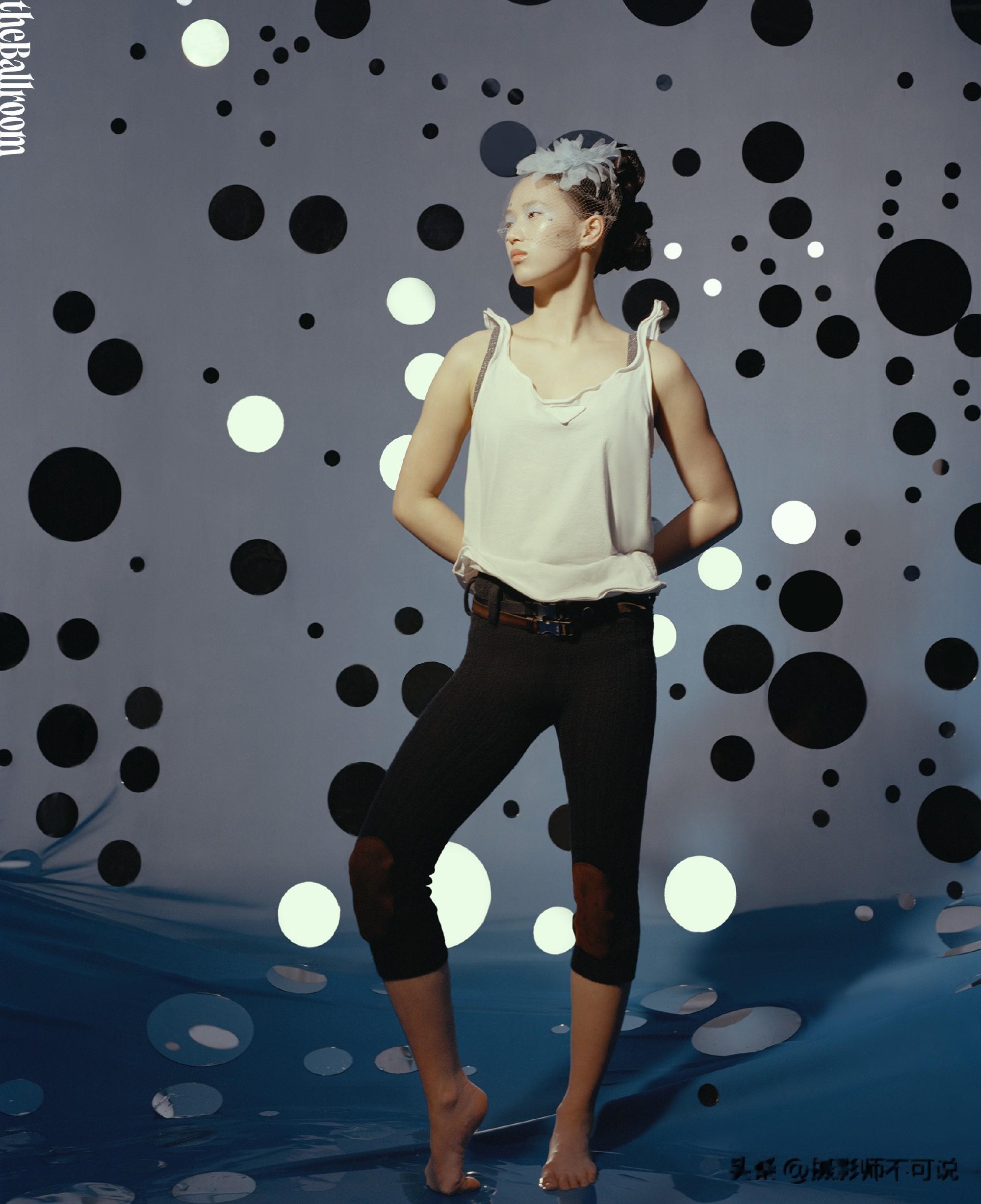 更加分的是背景设计的巧思——水波纹光影、几何曲线结构,既呼应了她常年相伴的泳池,又暗喻“时光之跃”的主题,让画面有了呼应感,不会显得空洞。此外呢,作品用光线放大了陈芋汐的“原生优势”——常年跳水训练造就的挺拔体态、紧实肌肉线条,这是普通模特再怎么凹也凹不出来的底气,也是摄影团队最会抓的点。比如白背心搭配黑色紧身裤的造型,光线从侧方打过来,清晰勾勒出马甲线和腿部肌肉的线条,不刻意、不油腻,把“汗水浇灌的美感”拍得淋漓尽致,既有少女的清爽,又有冠军的力量感,这种“健康美”的呈现,比千篇一律的“白瘦幼”修图更有冲击力,也更有记忆点。还有类似芭蕾风造型,光线柔和却不模糊,把她挺拔的肩颈、舒展的体态拍得恰到好处,甚至有“不输专业舞者”的优雅,可见摄影师对“体态捕捉”的精准度,值得新手学习。