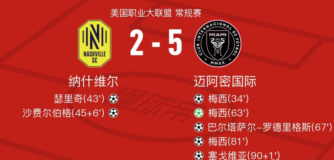 北京时间今天凌晨,迈阿密在美职联最后一轮比赛中,客场以5-2大胜纳什维尔!梅西本场上演帽戏,并有一次助攻,以29球绝对锁