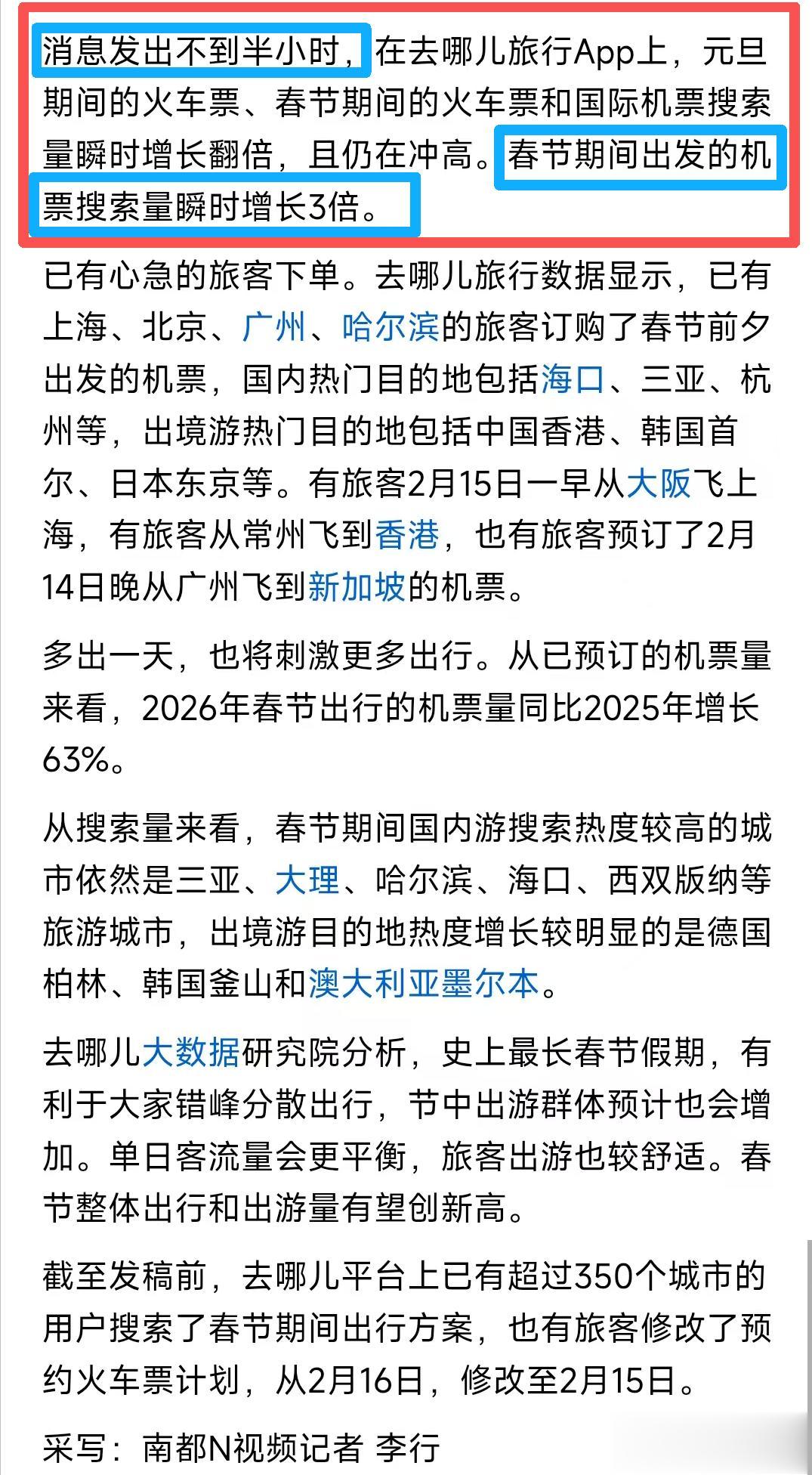 机票酒店搜索量暴增:打折力度或会降低有喜就有悲,但这个假期安排出来之后,很多本来不打算回家或者出门的人,也开始重新安排起了日程,有打算回家过年的,也有打算趁着这个小长假出门旅游的。导致春节期间的机票和酒店搜索量暴增!在消息发出不到半小时,搜索量直接增长了3倍!