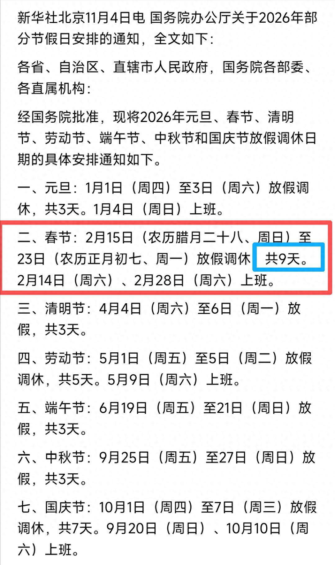 北京时间2025年11月4日,经相关部门审核批准,2026年的法定节假日明细公布了出来!顿时引起了轩然大波,但是其中最让人津津乐道的还是春节的假期:从腊月28一直放到正月初七,共9天!
