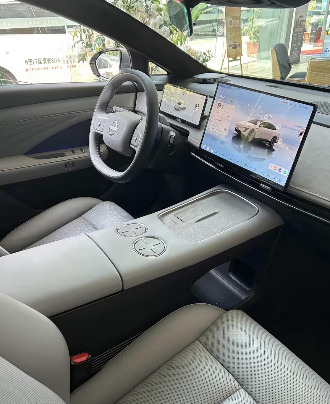日产N6的内饰布局也十分精简,环抱式座舱采用了大面积环保可再生面料铺陈,米白色和浅灰色的交替铺陈,贯穿式的空调出风口、银色金属元素以及无线充电面板,柔软细腻的质感和众多高科技配置相互融合,还配备了悬浮式彩色液晶仪表、悬浮式的中控液晶大屏,内置了高通骁龙8295P芯片,搭载了NISSAN OS车技系统,支持更多的使用场景。