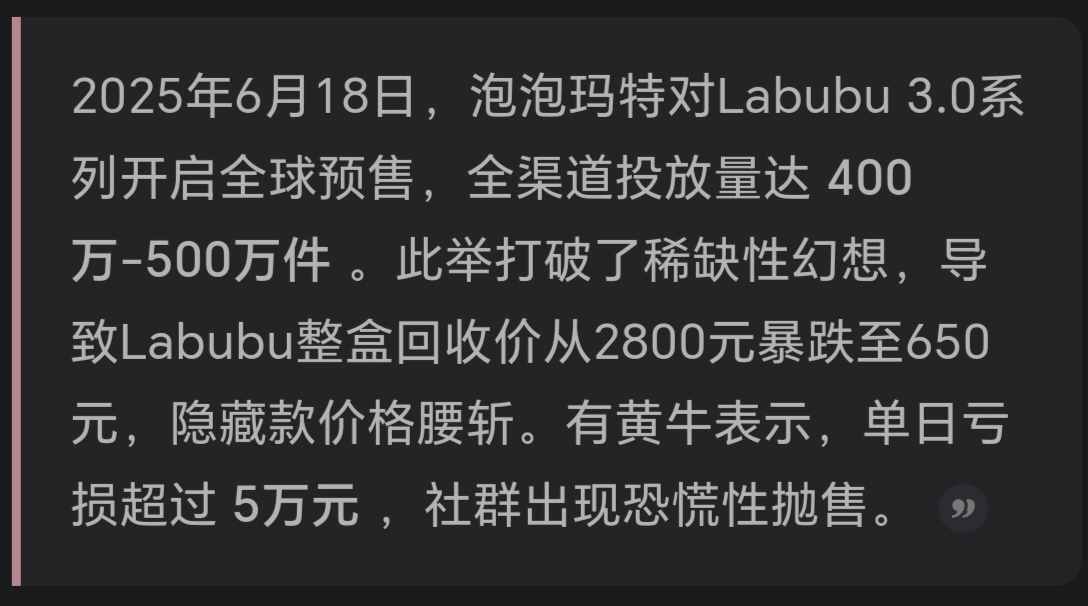 但现在看来,Labubu的泡沫正在破裂,热度下降、收藏需求降温,之前营造的“饥饿营销”遭到强烈反噬,官方一直在大规模补货。