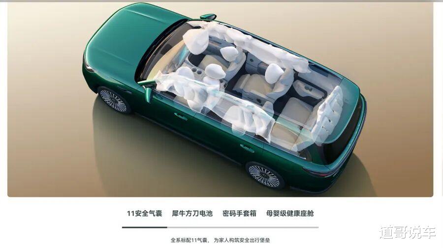 安全配置:全系标配11安全气囊,含主驾膝部气囊、2200mm侧气帘、双腔远端气囊、后风窗气囊,配合磐石车身2.0,88%高强度钢铝,打造家庭移动安全堡垒;