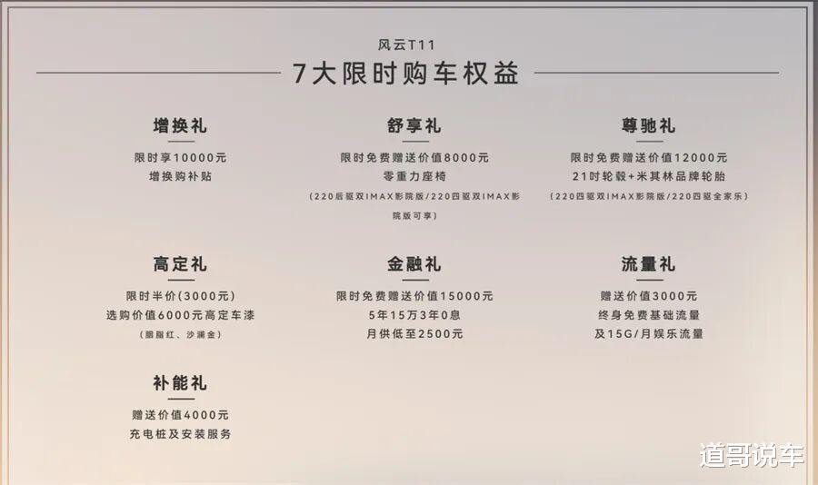 近期正式上市的风云T11,推出4款配置,限时抢鲜价17.99万-23.99万元。新车定位智享大六座旗舰SUV,以超安全、大空间、更豪华、好智慧四大核心价值,重新划定家用豪华SUV标准。全系标配11项安全气囊、磐石车身等硬核配置,结合极具诚意的价格,让百万级豪华体验触手可及。并且有着丰厚的限时购车权益:10000元增换购补贴,赠送零重力座椅,21寸轮毂,充电桩和免费流量,在从购车、用车到后期养车等多个维度降低用户门槛与成本,显著提升了新车的性价比和市场吸引力。