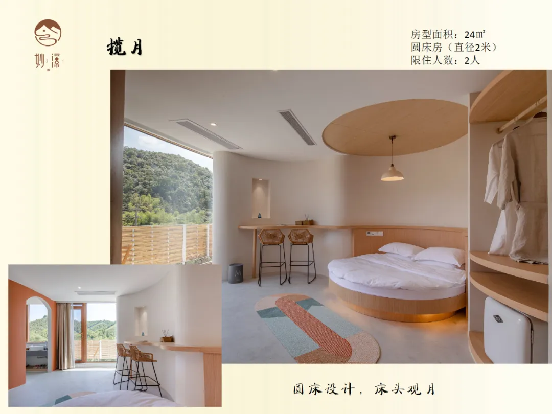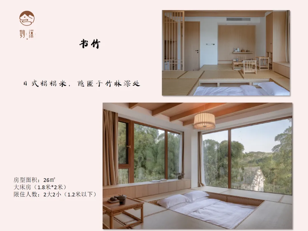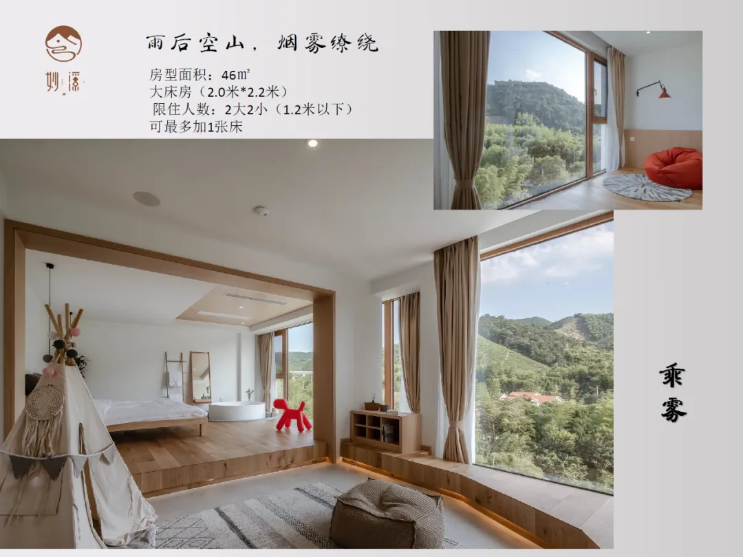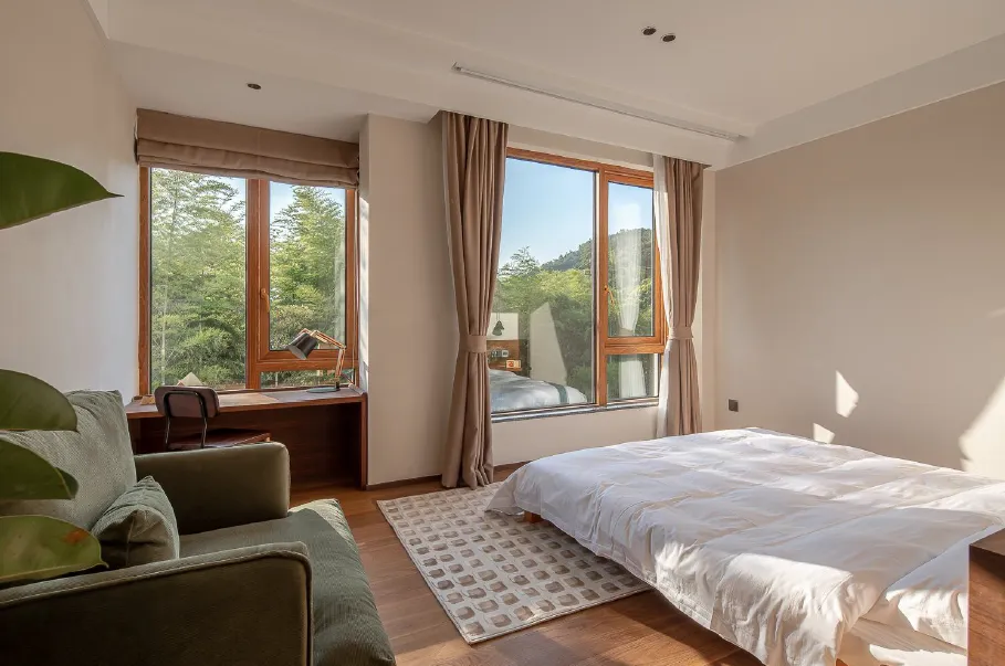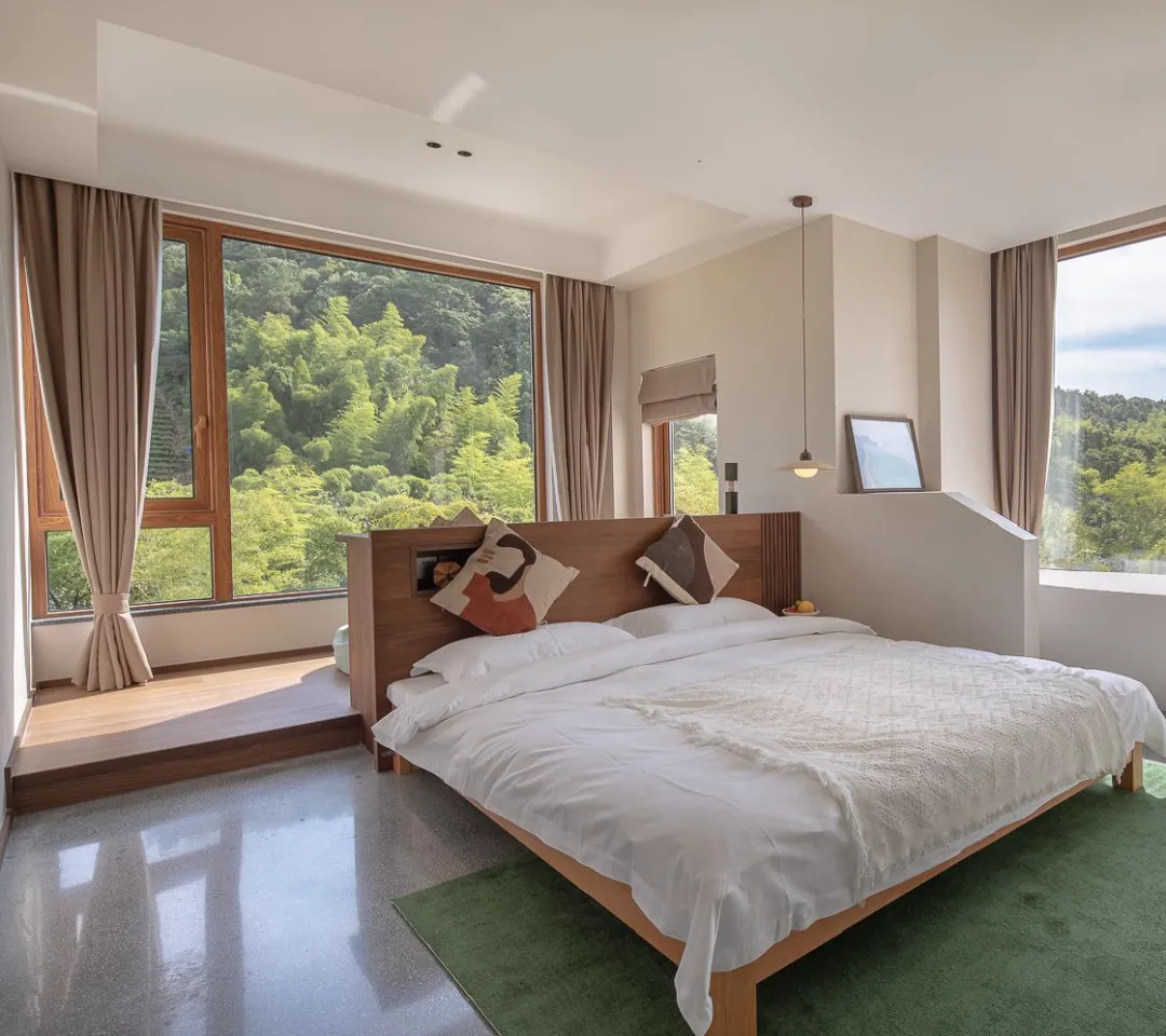 妙嬉的客房以简约风格为主,Loft 户型“朝朝”适合看日出,清晨阳光从二楼天窗洒进来,唤醒整座山林;家庭房“双双”有两张大床,还能加榻榻米,带娃出行也毫无压力。每个房间的超大落地窗都能将竹海、山景、庭院风光尽收眼底。