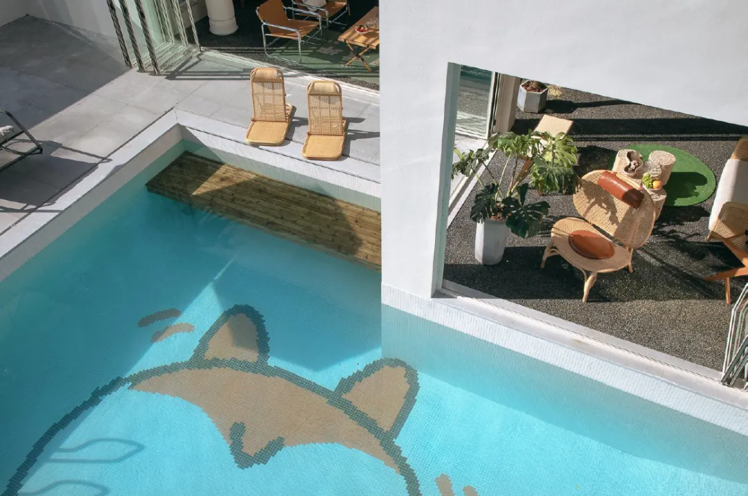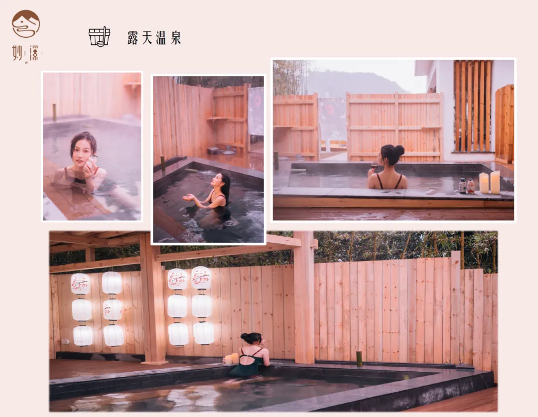 最绝的是泳池边的场景:天蓝色的池水映着白房子,坐在池边的遮阳伞下,吹着带着草木香的风,喝一口冰镇汽水,那一刻真的会产生错觉——仿佛下一秒就能听见海浪声,这种 “在山野里遇见海岛” 的惊喜,大概只有妙嬉能给。