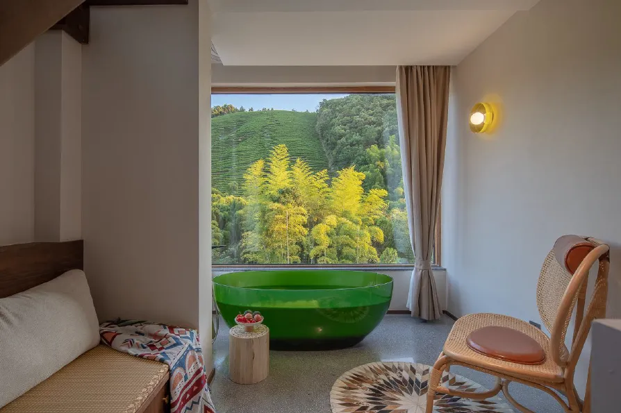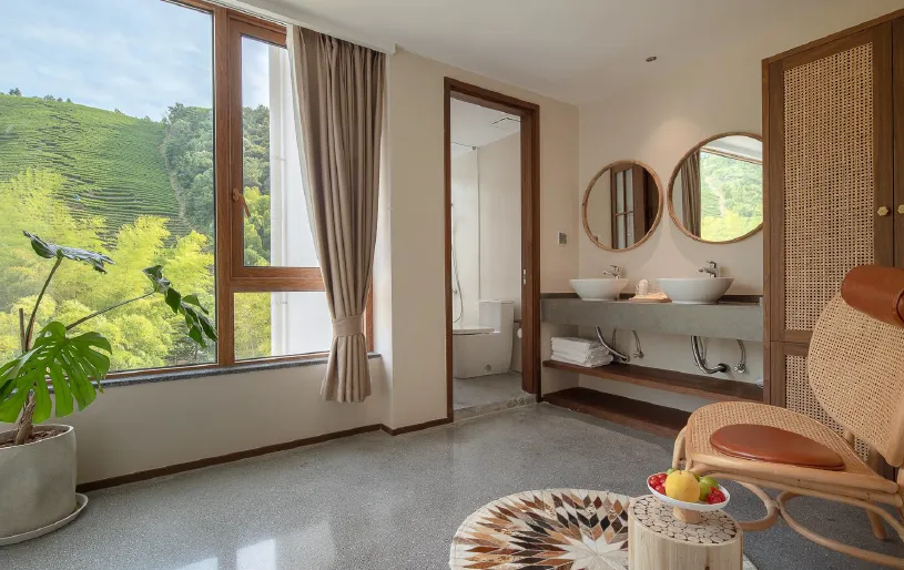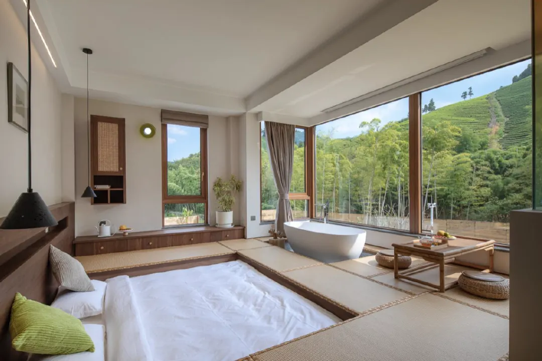 作为湖州唯一的全国甲级民宿,妙溪给我的第一印象是“结庐在人境,而无车马喧”的通透感。白墙原木的独栋别墅依山而建,被竹海与茶山温柔包裹,清晨推窗时,山间雾气会顺着落地窗的缝隙钻进来,带着草木的清香。