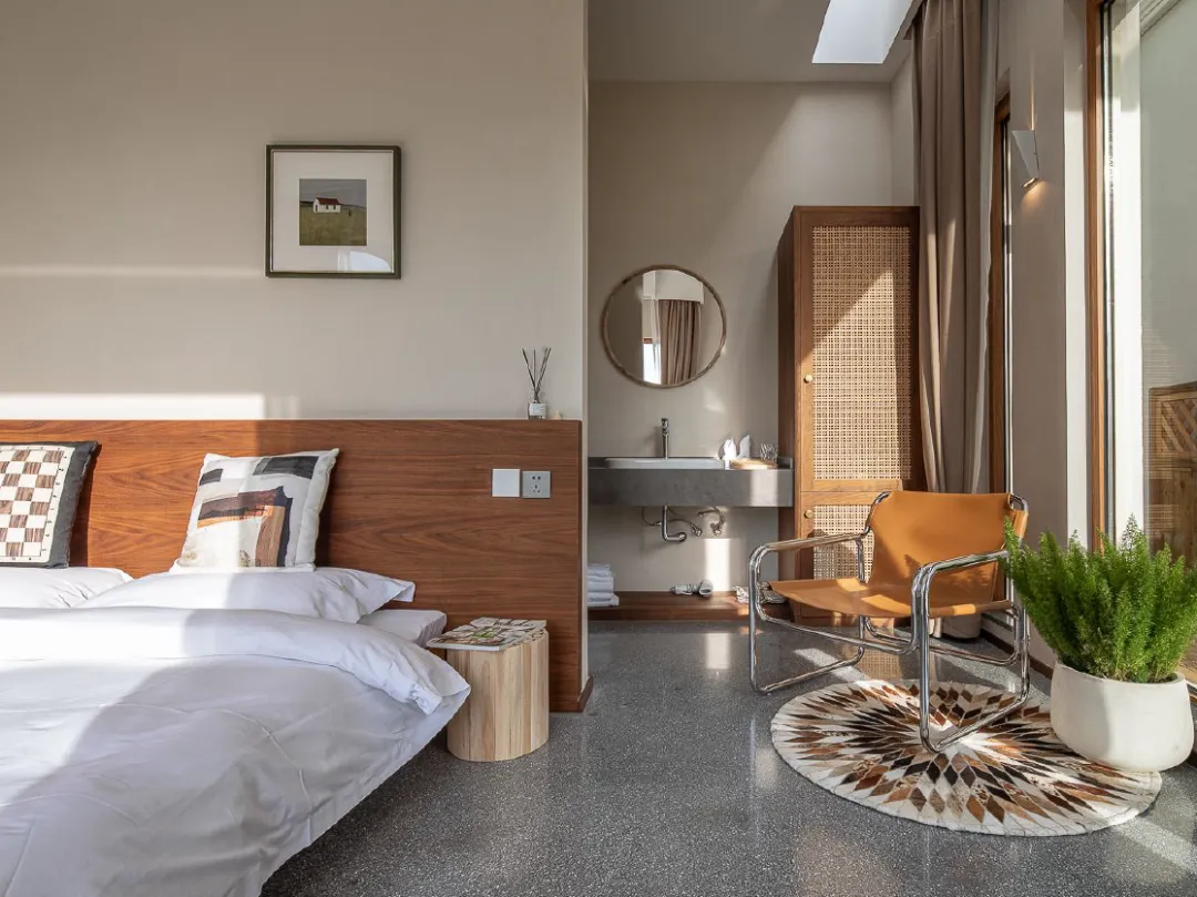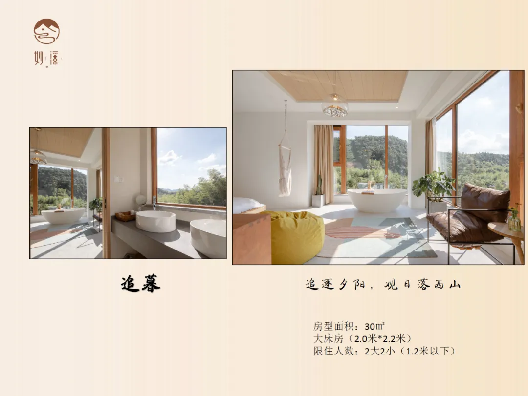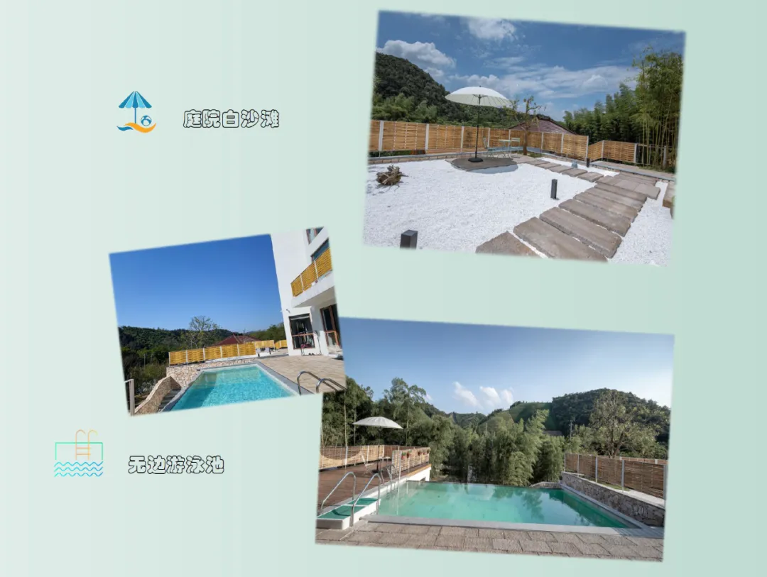 妙溪的房间布局将山水巧妙地铺陈在眼前,窗户就是自然取景框,每一面窗都框着不同的山景。你可以看到窗外盎然的绿意,也能看到傍晚的彩霞将山景染成暖金色。夏天,可以到民宿的无边泳池游泳,庭院的白色沙滩也布置得相当惬意,拍照时竟有几分海岛度假的错觉。冬天,民宿还开放有温泉池,能让你体验舒筋活络的畅快。