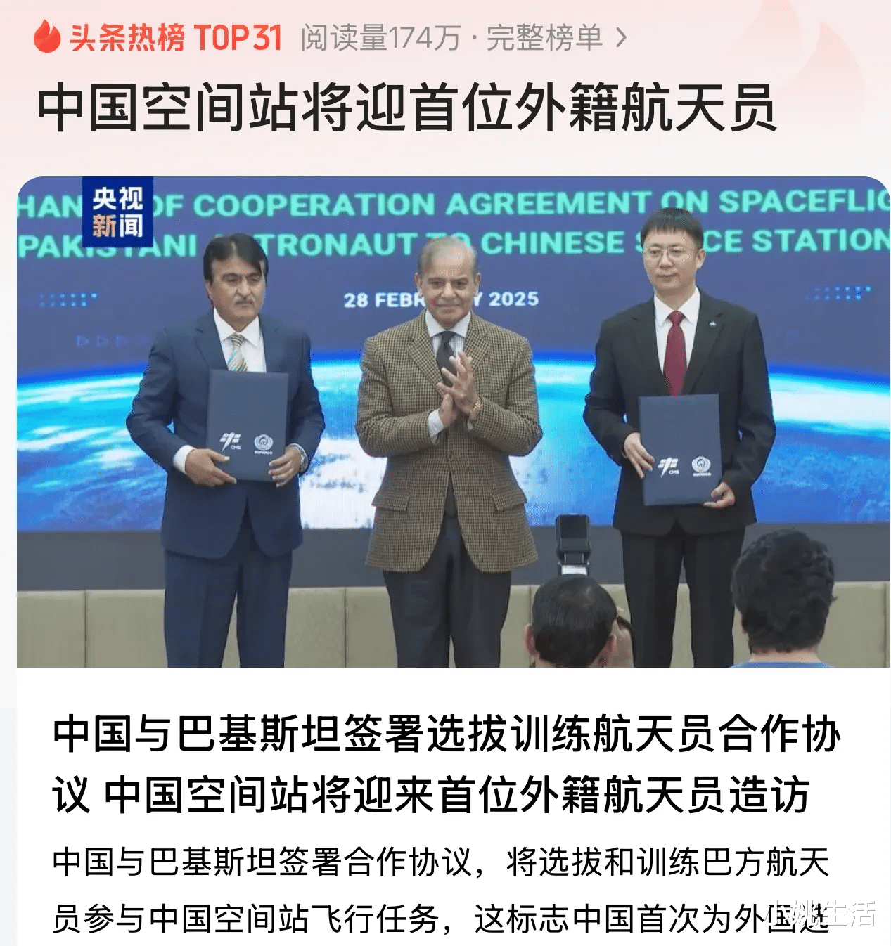 2025年2月28日,中巴两国在伊斯兰堡总理府签署《关于选拔、训练巴基斯坦航天员并参与中国空间站飞行任务的合作协议》。这是中方首次为外国选拔航天员,意味着“中国天宫”即将迎来首位外籍访客,也标志着中国载人航天从“自主研制”走向“国际共享”的新阶段。